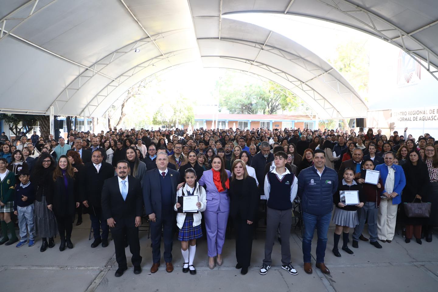 En el evento que se realizó en el Centro Regional de Educación Normal de Aguascalientes (CRENA), la gobernadora estuvo acompañada por Leonardo Montañez Castro, presidente Municipal de Aguascalientes; Luis Enrique Gutiérrez Reynoso, director general del Instituto de Educación de Aguascalientes (IEA); Angélica Núñez Bernal, directora del CRENA; y Cristian Yoan Malugin Romo, alumno del Telebachillerato “Loma del Refugio”.