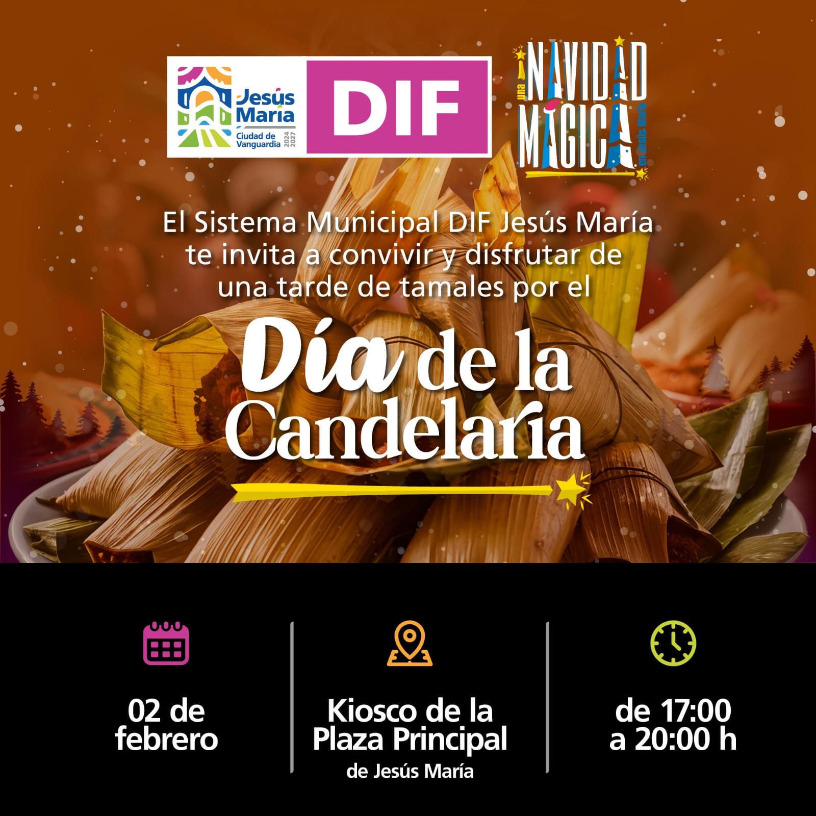 Este evento, se llevará a cabo el próximo 2 de febrero en el Kiosco de la Plaza Principal de Jesús María, en un horario de 17:00 a 20:00 horas, donde el presidente municipal, César Medina y la presidenta del Sistema DIF Municipal, Silvia de la Cruz, estarán regalando tamales a las personas que asistan.