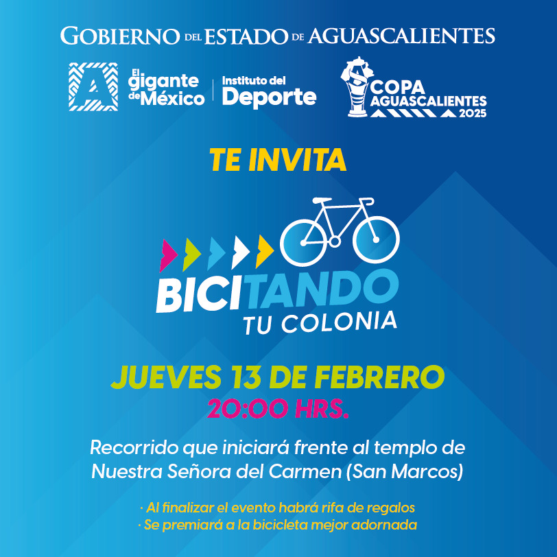 El Gobierno del Estado de Aguascalientes, a través del Instituto del Deporte, invita a ciclistas de todas las edades a participar en la rodada “Bicitando tu Colonia”, que se realizará este jueves 13 de febrero a las 8:00 de la noche por las principales calles de los barrios tradicionales de la capital, en un circuito de 8.5 kilómetros.