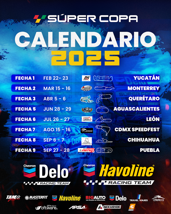 Iniciando en Yucatán, serán hasta el momento 8 sedes a visitar, quedando una por confirmarse en el mes de mayo, cerrando el 25 en Puebla el 28 de septiembre, fecha en la que el equipo espera pelear por el título con sus dos pilotos.