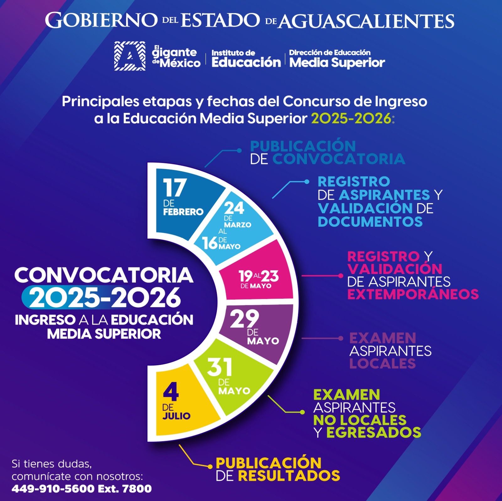 El Gobierno del Estado de Aguascalientes, a través del Instituto de Educación de Aguascalientes (IEA), anuncia la publicación de la convocatoria de nuevo ingreso a Educación Media Superior para el ciclo escolar 2025-2026, la cual puede ser consultada en la página https://educacionmedia.iea.edu.mx/.