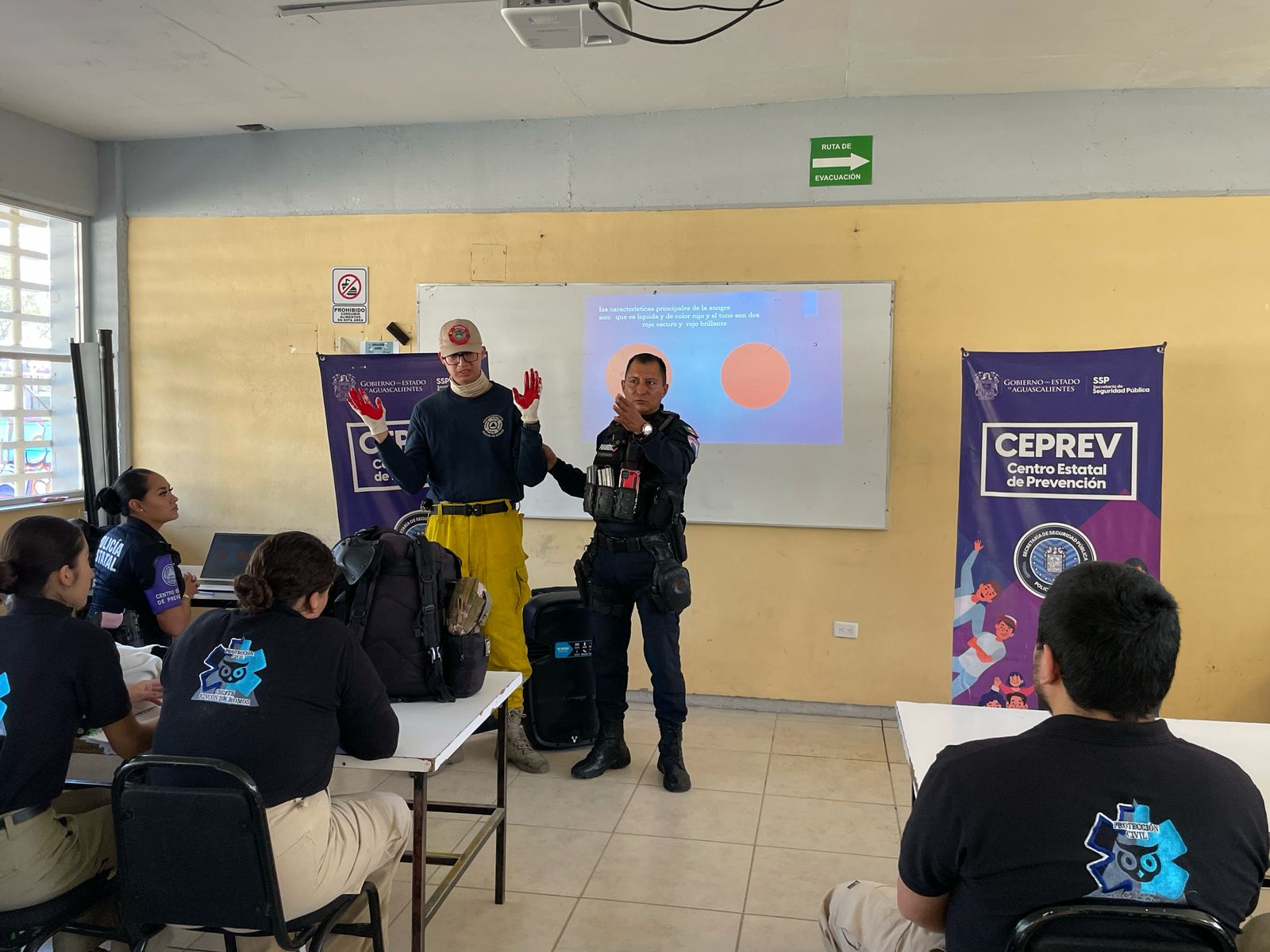 Como parte de las acciones de proximidad y prevención que lleva a cabo la Secretaría de Seguridad Pública del Estado, participantes del club voluntario de Protección Civil y Emergencias del CECyTEA, plantel Rincón de Romos, recibieron un curso de capacitación en temas prehospitalarios y de primeros auxilios.