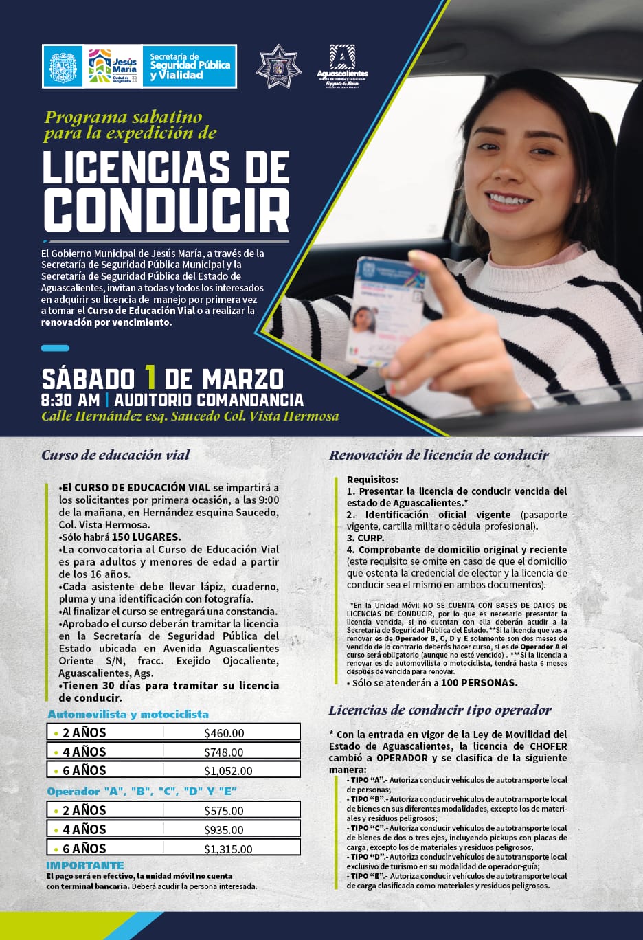 El Gobierno Municipal de Jesús María a través de la Secretaría de Seguridad Pública y Vialidad Municipal y en coordinación con la Secretaría de Seguridad Pública del Estado de Aguascalientes, informa que el próximo 01 de marzo se llevará a cabo el programa sabatino para la expedición de licencias de conducir en Jesús María.