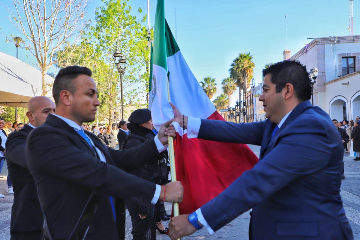 En el marco del Día de la Bandera, el presidente municipal de Jesús María, César Medina encabezó como cada lunes la ceremonia de honores a la bandera; en esta ocasión, se llevó a cabo el abanderamiento de las delegaciones, reafirmando el compromiso cívico de la comunidad.