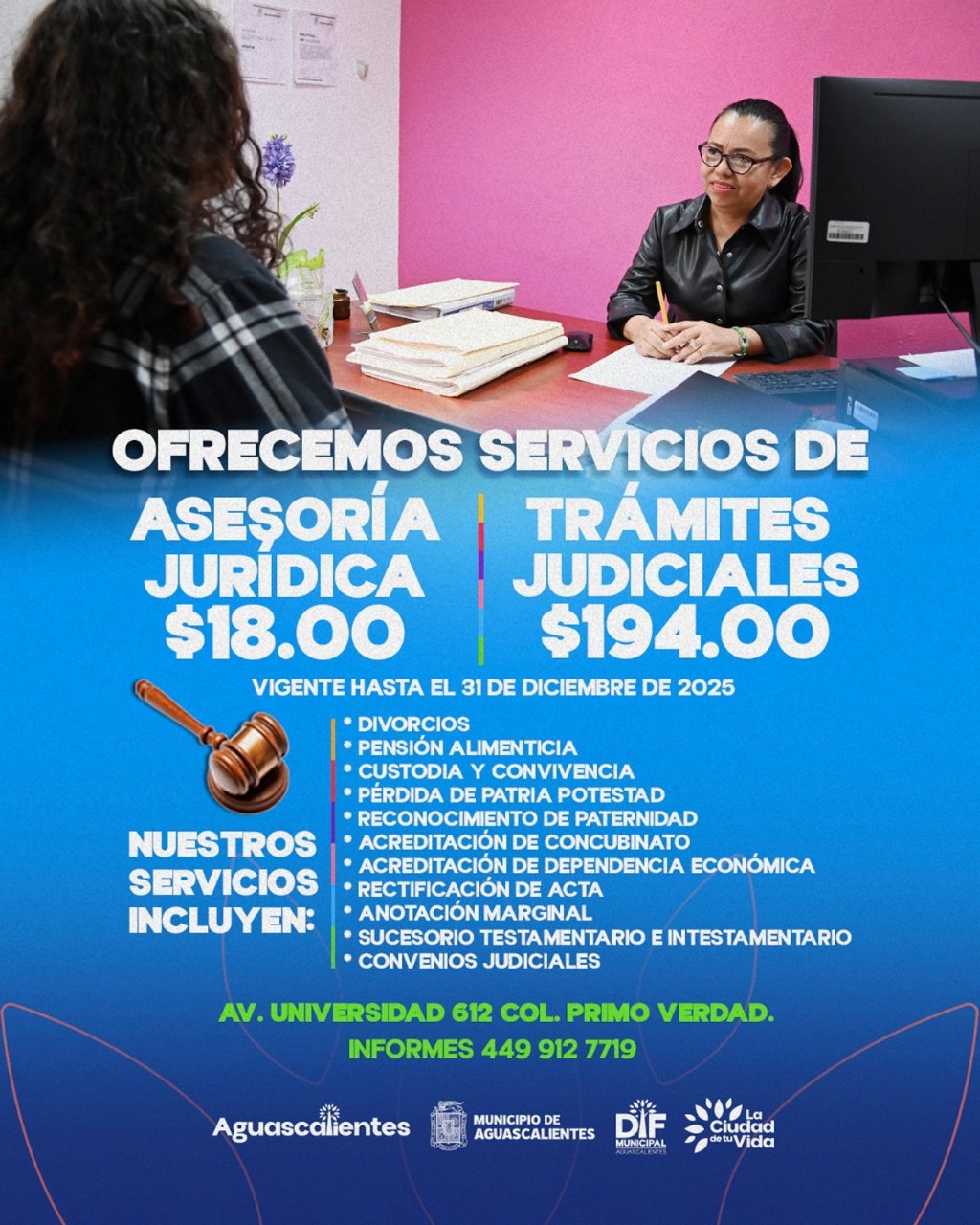 El DIF Municipal de Aguascalientes pone a disposición de la población los servicios de su Departamento Jurídico, donde se brinda asesoría y acompañamiento en diversos trámites legales a costos accesibles.