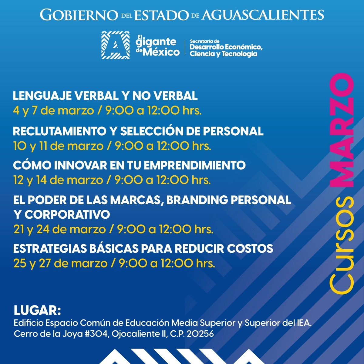 Comentó que el cupo es limitado y se requiere la inscripción a cada curso de manera individual; dijo que las sesiones se llevarán a cabo de 9:00 a 12:00 horas en el Edificio Espacio Común de Educación Media Superior y Superior, del Instituto de Educación de Aguascalientes, ubicado en Cerro de la Joya #304, fraccionamiento Ojocaliente II.