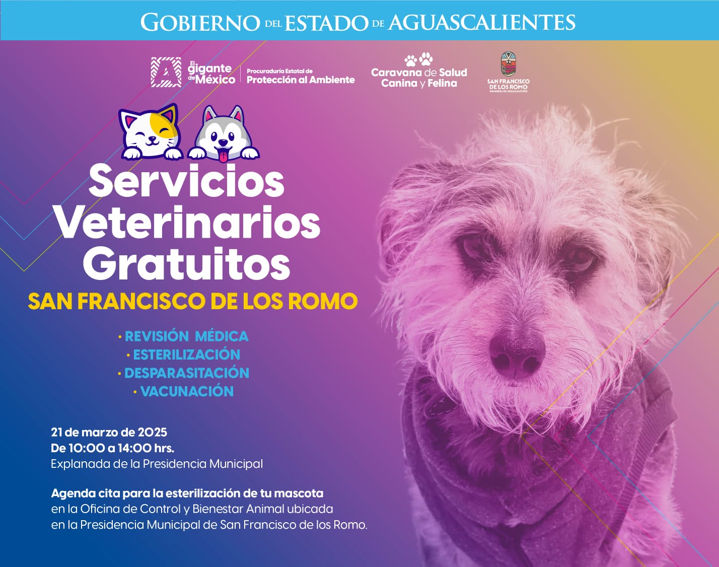 El Gobierno del Estado invita a las y los propietarios de mascotas a participar en la Caravana de la Salud Canina y Felina en San Francisco de los Romo, este 21 de marzo de 10:00 a 14:00 horas, donde todos los servicios son gratuitos.