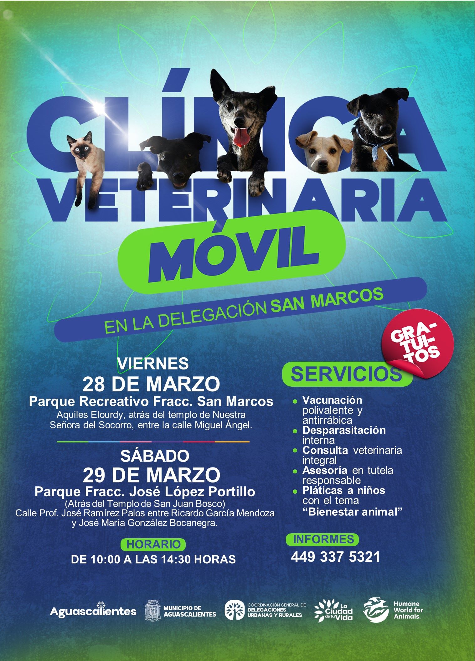 El viernes 28 de marzo, la Clínica Veterinaria Móvil estará en el parque recreativo del fraccionamiento San Marcos y el sábado 29 de marzo en el parque del fraccionamiento José López Portillo, de las 10:00 a las 14:30 horas.