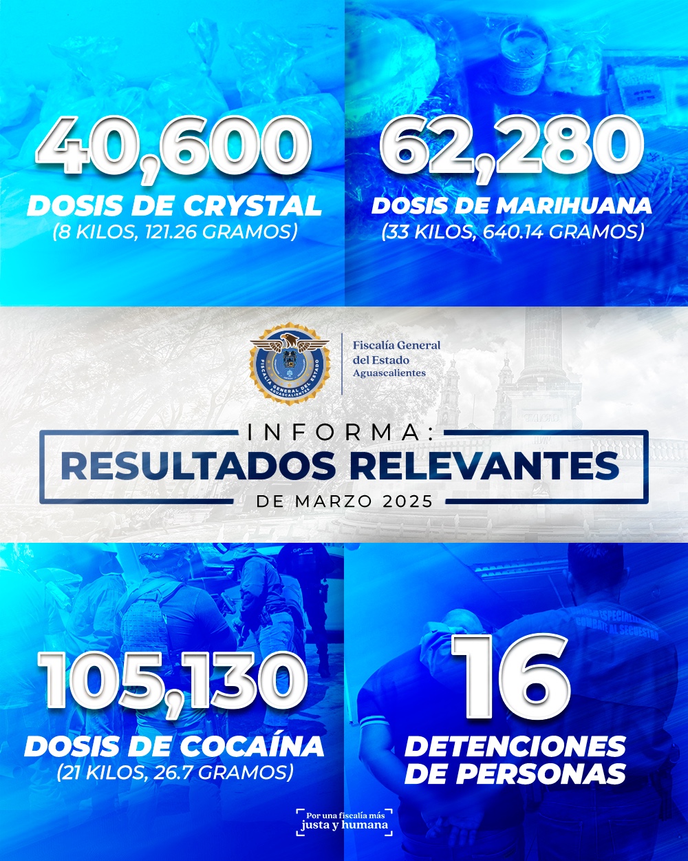 Las estrategias implementadas en la nueva era de la Fiscalía General del Estado en el combate al narcomenudeo en la entidad, rindieron buenos resultados en el mes de marzo, luego de que se lograran asegurar más de 62 kilogramos de sustancias ilícitas en diversos puntos de la entidad, así como la captura de 16 personas relacionadas con la distribución de las mismas, las cuales en su momento fueron vinculadas a proceso.