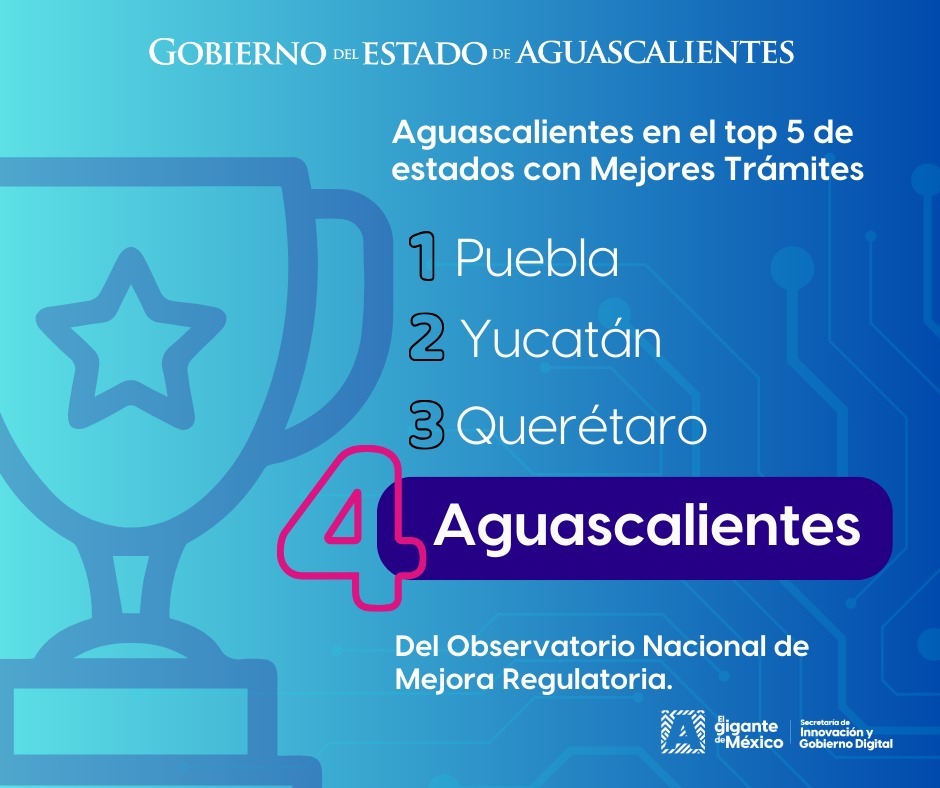 Ramiro Pedroza Márquez, titular de la Secretaría de Innovación y Gobierno Digital (Sigod), informó que al inicio de la actual administración estatal, Aguascalientes se ubicaba en el lugar 22 a nivel nacional en el Indicador de Avance de la Estrategia Nacional de Mejora Regulatoria (IENMR). Gracias a acciones como la simplificación y digitalización de trámites, así como a la implementación del Expediente Digital, el estado logró avanzar 18 posiciones en dicha evaluación.