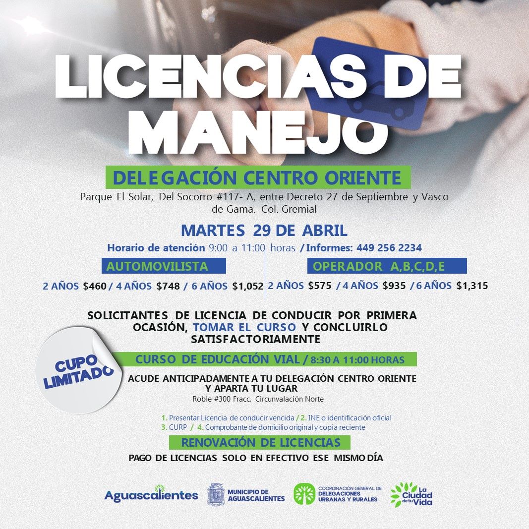 La Coordinación General de Delegaciones Urbanas y Rurales dio a conocer que gracias al trabajo conjunto entre el Municipio de Aguascalientes y el Gobierno del Estado, durante la última semana de abril, y los meses de mayo, junio, julio y agosto se llevará a cada una de las delegaciones municipales el programa de renovación de licencias para motociclista, automovilista y operador tipo A, B, C, D y E.