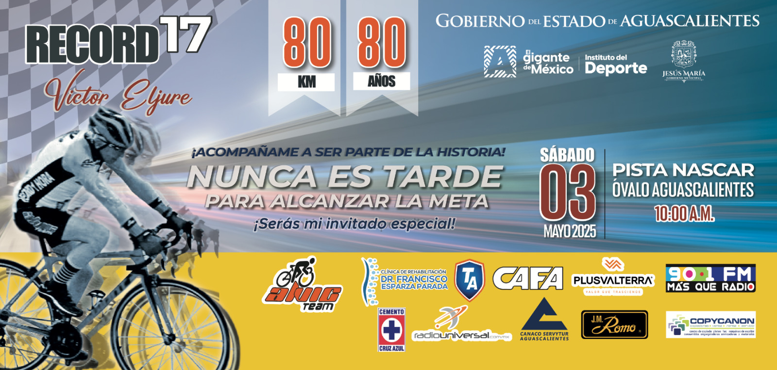 Este sábado 3 de mayo a las 10:00 am, acompáñanos en el óvalo de Aguascalientes y sé testigo del intento de nuestro ciclista más longevo, con 80 años, de recorrer 80 kilómetros