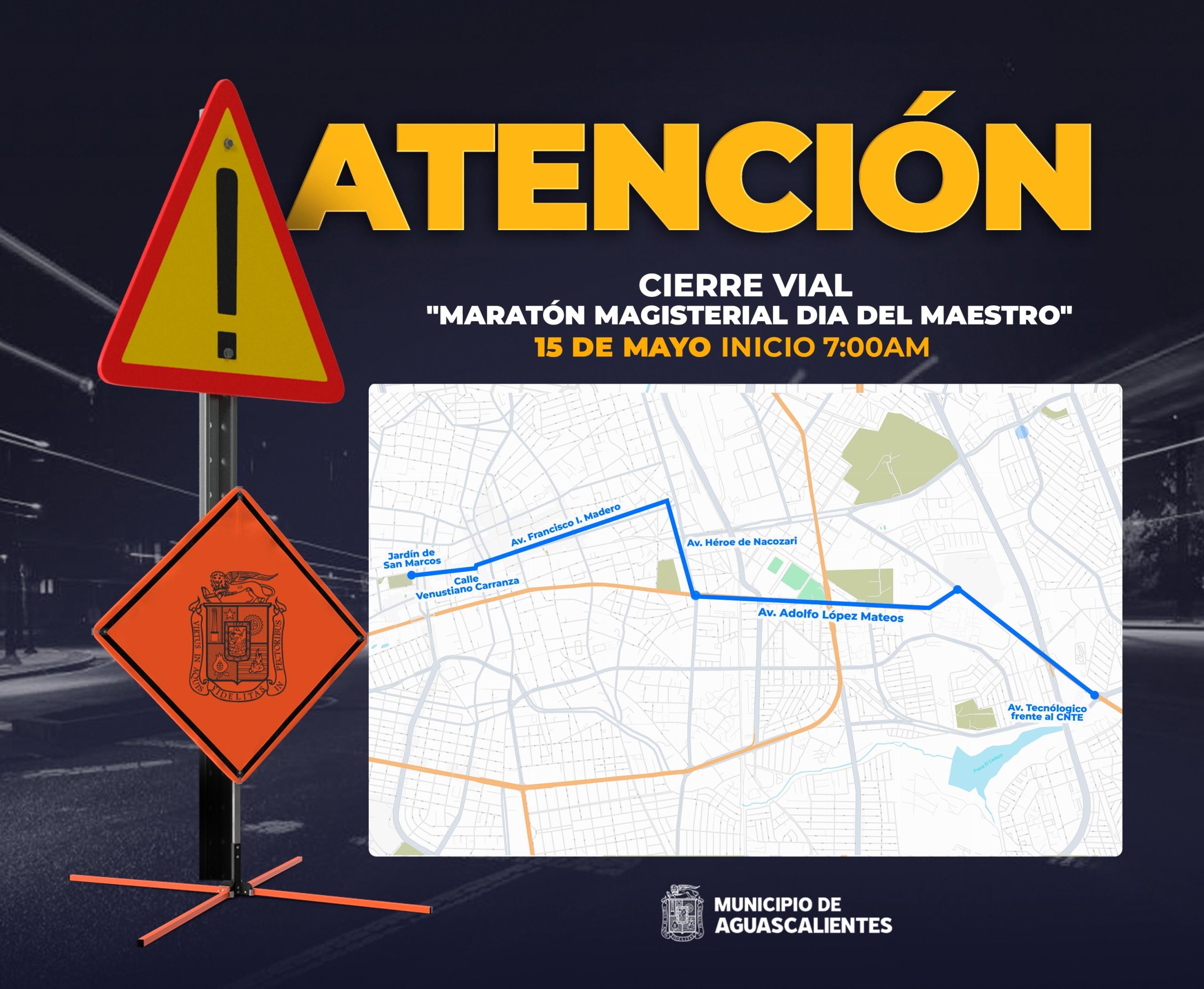 La Secretaría de Seguridad Pública Municipal de Aguascalientes, a través de la Dirección de Tránsito y Movilidad, informa que el próximo jueves 15 de mayo se llevará a cabo un operativo vial con motivo del Maratón por el Día del Maestro, que recorrerá distintas calles de la ciudad.