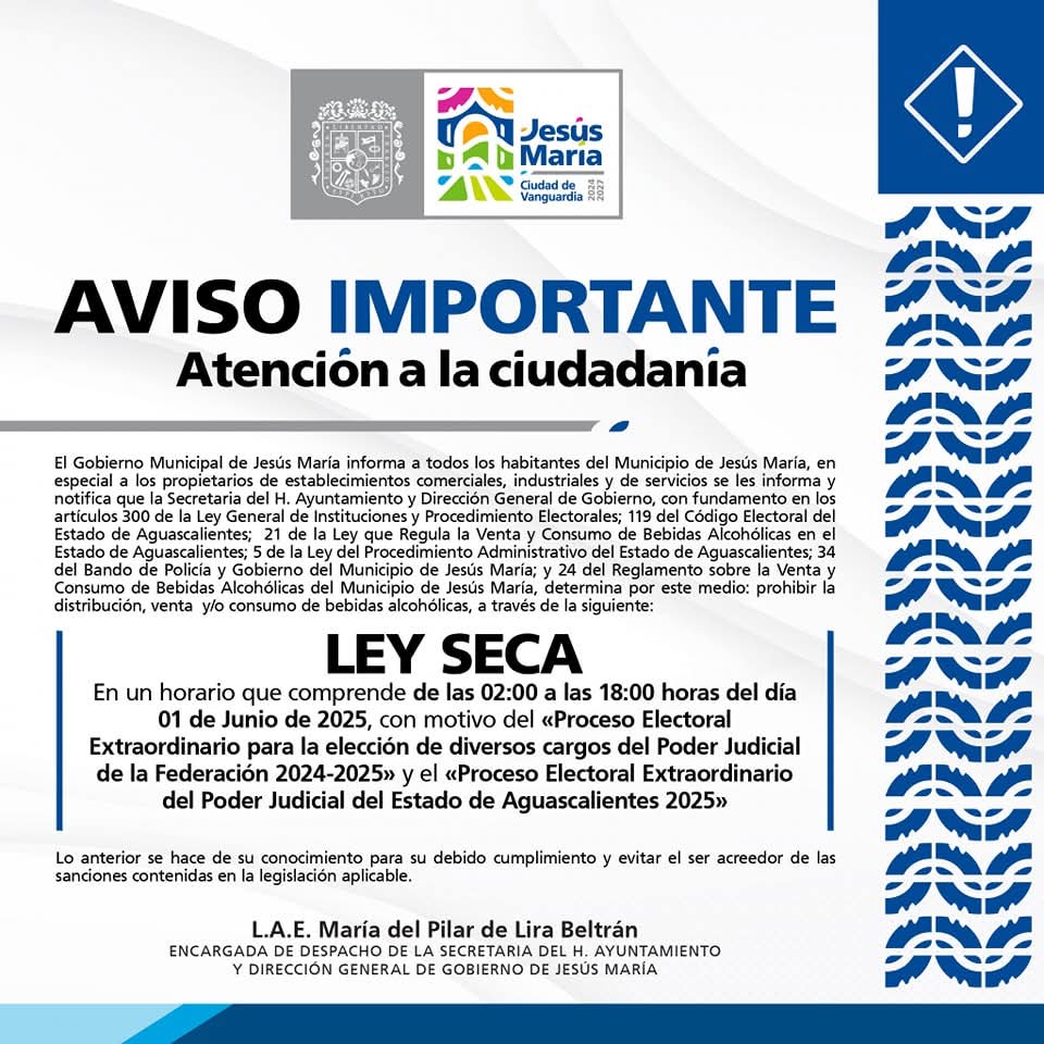 El próximo domingo 01 de junio habrá Ley Seca de las 02:00 a las 18:00hrs.