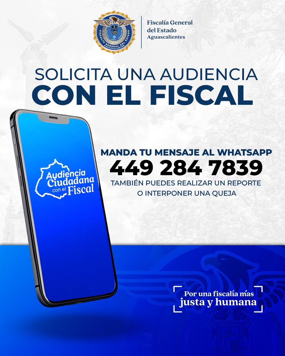 Se hace una atenta invitación a la ciudadanía para que se sume a estas audiencias públicas. Las personas interesadas podrán registrarse enviando un mensaje al número de WhatsApp 449 284 7839, incluyendo algunos datos personales. Una vez recibida la solicitud, se les confirmará la fecha en la que serán atendidas en el auditorio de la Vicefiscalía de Investigación del Delito.