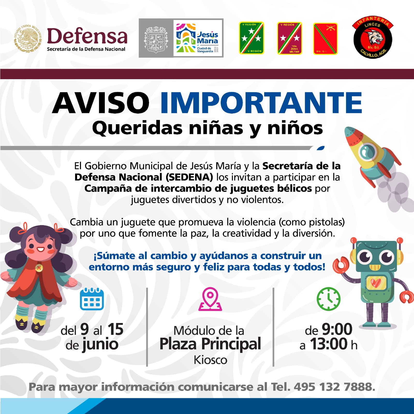 Del 9 al 15 de junio de 2025, el Gobierno Municipal de Jesús María, en coordinación con la Secretaría de la Defensa Nacional (SEDENA), llevará a cabo la Campaña de Canje de armas de fuego en la Plaza Principal, en un horario de 9:00 a 13:00 horas.