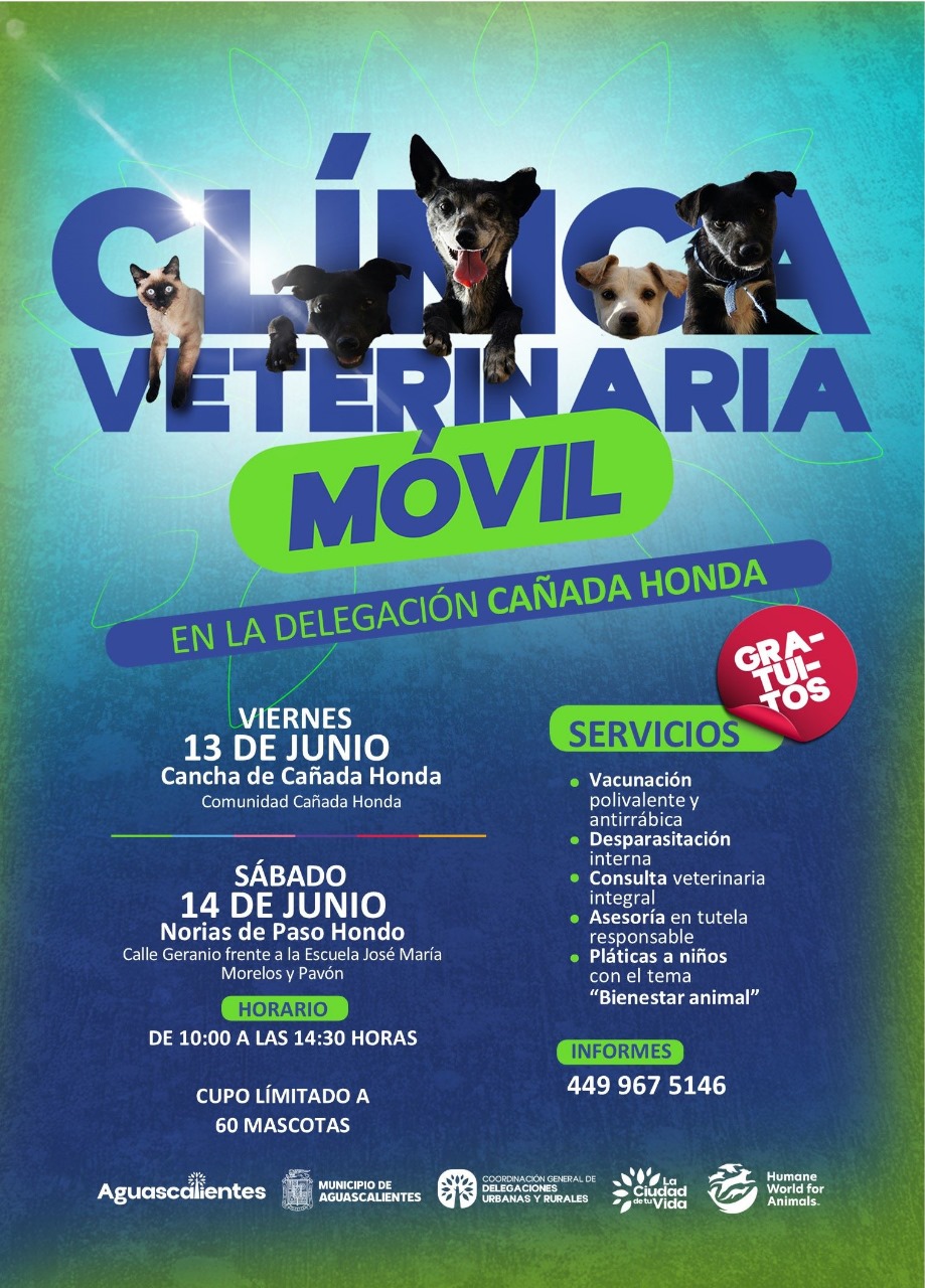 Para este viernes 13 de junio, los interesados podrán acudir a la Comunidad de Cañada Honda y el sábado 14 de junio a la Comunidad de Norias de Paso Hondo donde la Clínica Veterinaria Móvil realizará vacunación polivalente y antirrábica para perros y gatos, además de desparasitación interna, consultas veterinarias integrales, asesorías en tutela responsable y pláticas para niños con el tema de Bienestar Animal.