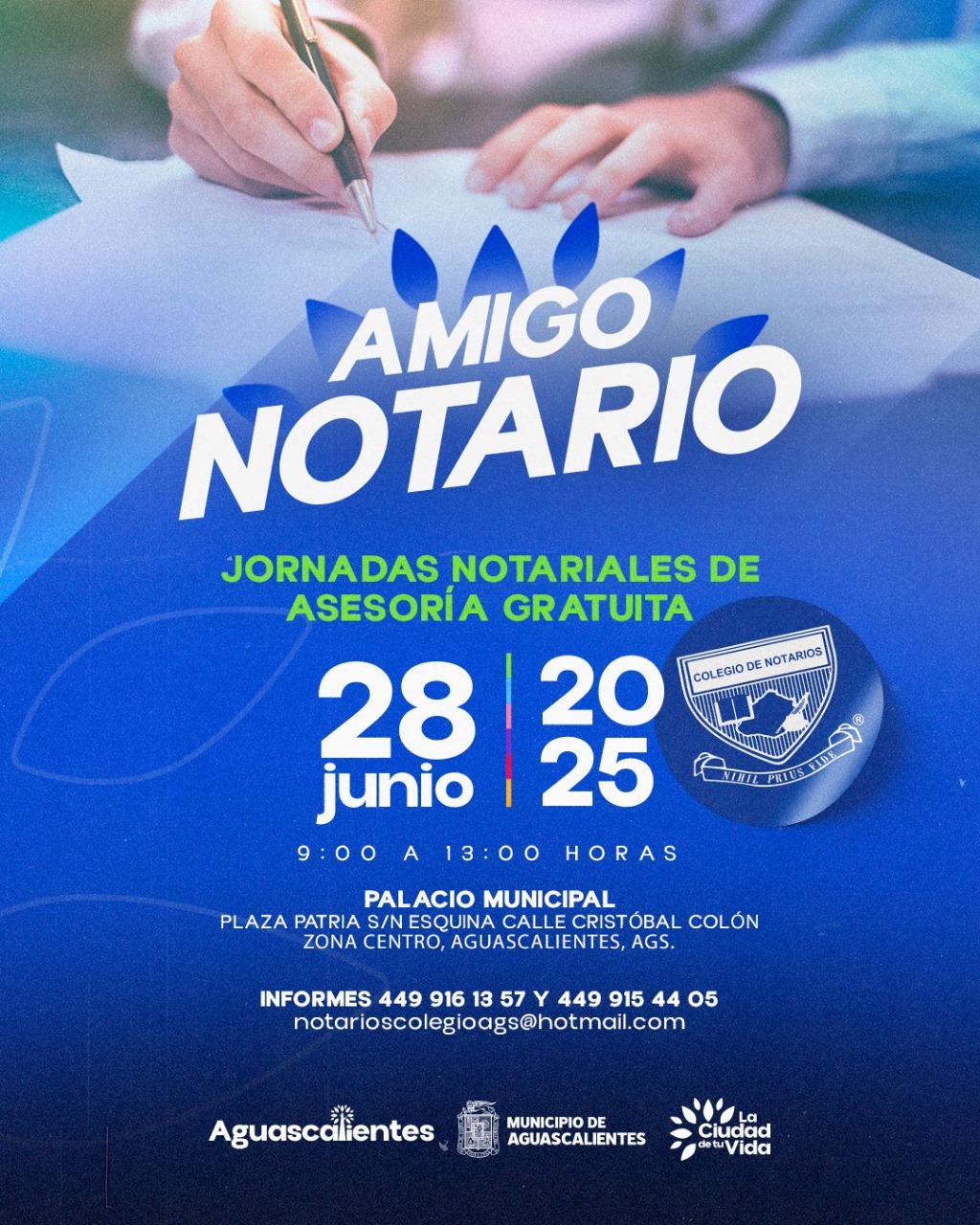 El Municipio de Aguascalientes invita a la ciudadanía a la jornada notarial gratuita que se llevará a cabo este sábado 28 de junio, de 9:00 a 13:00 horas en Palacio Municipal, en Plaza de la Patria y calle Cristóbal Colón s/n, zona centro.