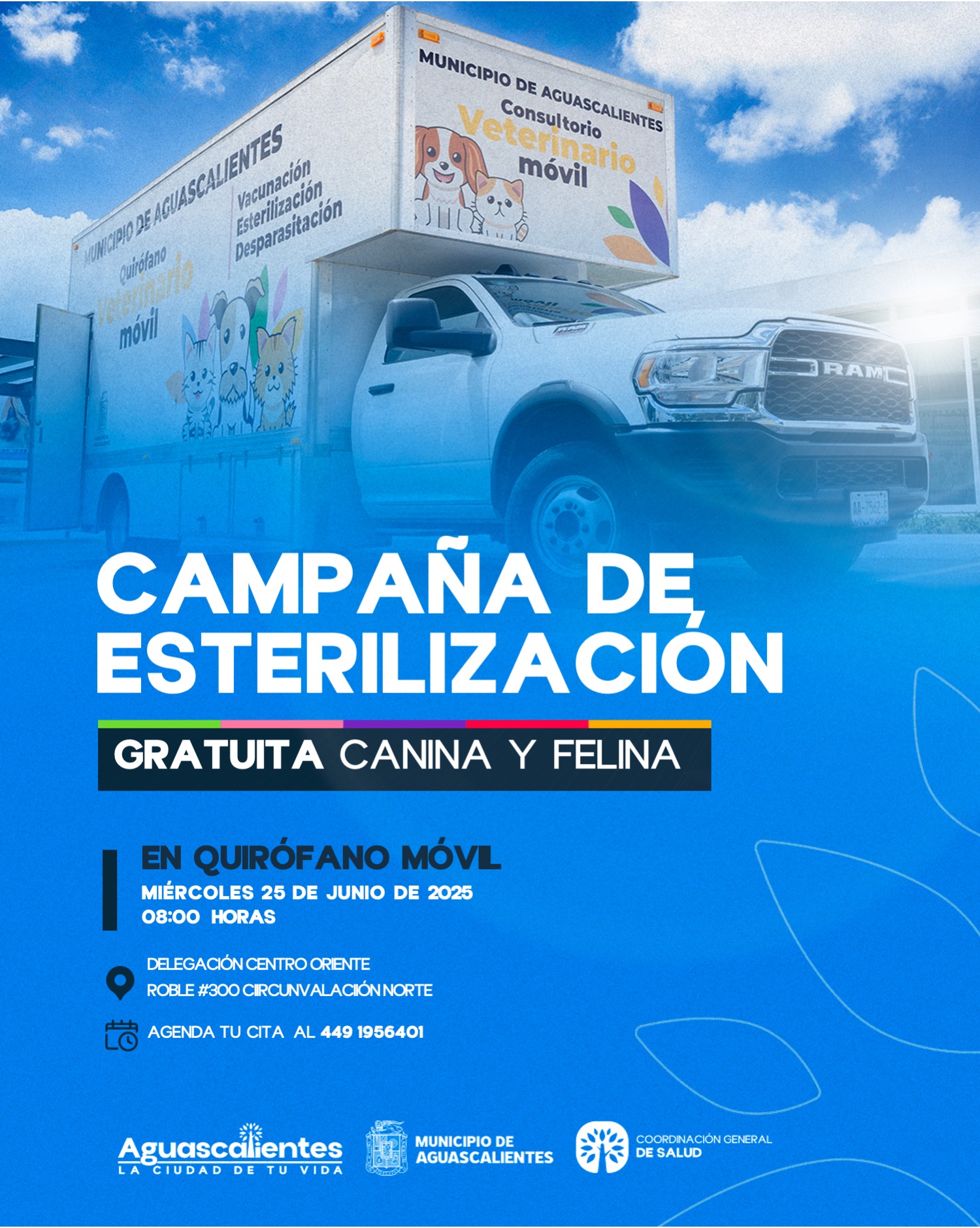 La Coordinación General de Salud del Municipio de Aguascalientes informa que este miércoles 25 de junio, llevará los servicios del Quirófano Veterinario Móvil a la Delegación Centro Oriente, ubicada en la calle Roble No. 300, fraccionamiento Circunvalación Norte, a partir de las 8:00 horas.