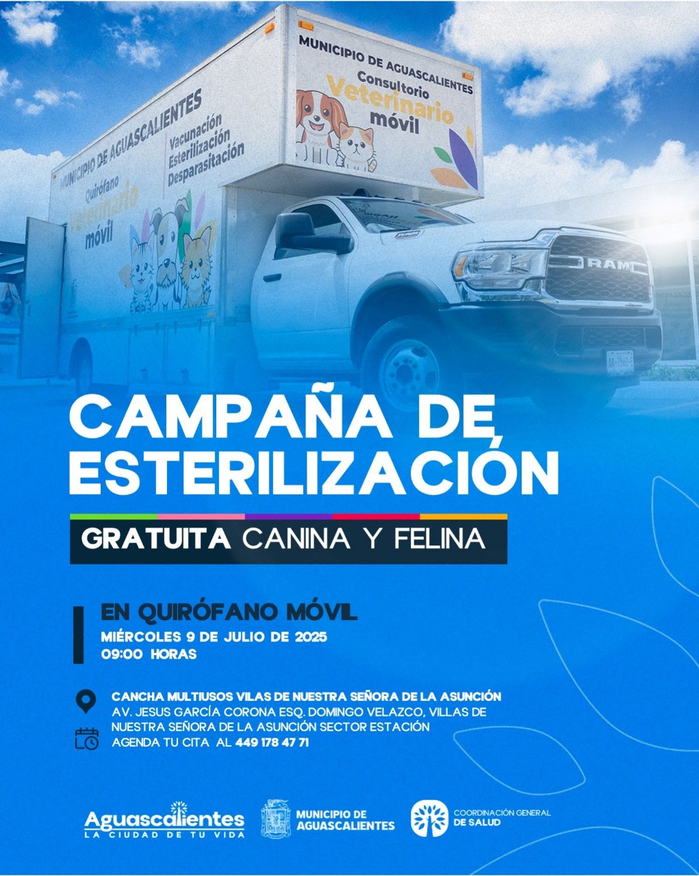 El miércoles 9 de julio del presente año a las 9:00 horas el Quirófano Veterinario Móvil de la Coordinación General de Salud del Municipio de Aguascalientes estará presente en el fraccionamiento Villas de Nuestra Señora de la Asunción, en donde se llevará a cabo una jornada de esterilización para caninos y felinos.