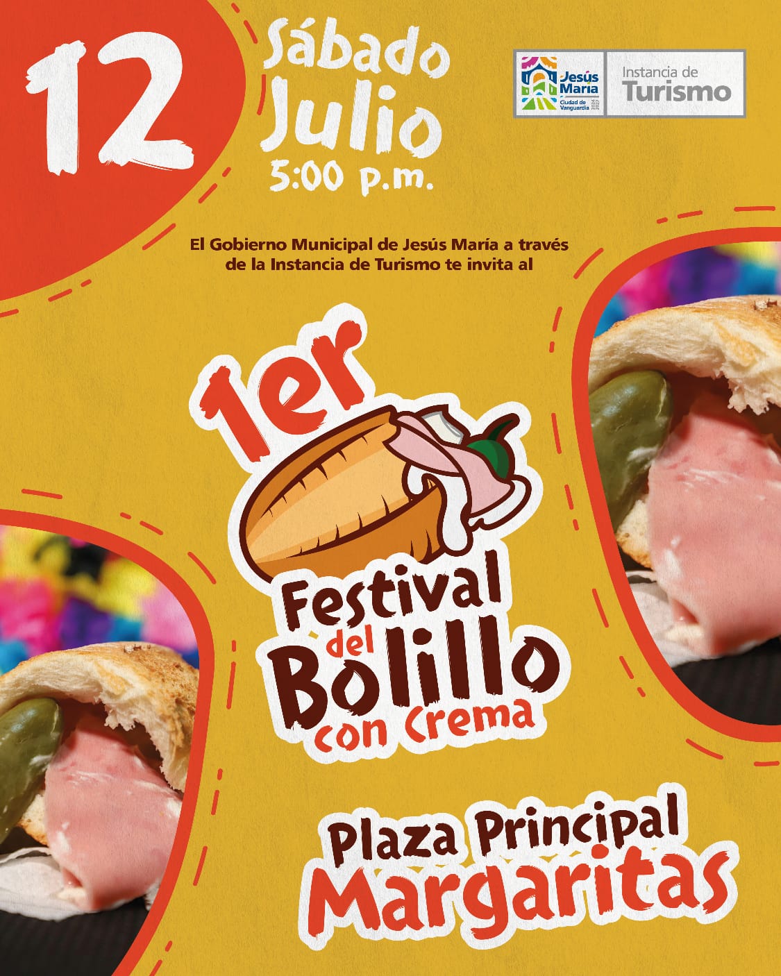 El Gobierno Municipal de Jesús María, a través de la Instancia de Turismo, te invita al 1er Festival del Bolillo con Crema este sábado 12 de julio a las 5:00 p.m. en la Plaza Principal de Margaritas.