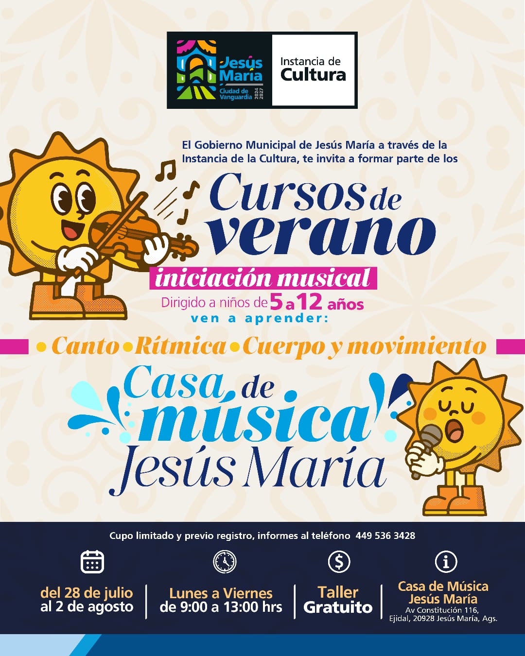 El Gobierno Municipal de Jesús María, a través de la Instancia de Cultura, invita a la ciudadanía a inscribir a sus hijas e hijos a los cursos de verano de iniciación musical, que se llevarán a cabo del 28 de julio al 2 de agosto, en un horario de 9:00 a 13:00 horas.