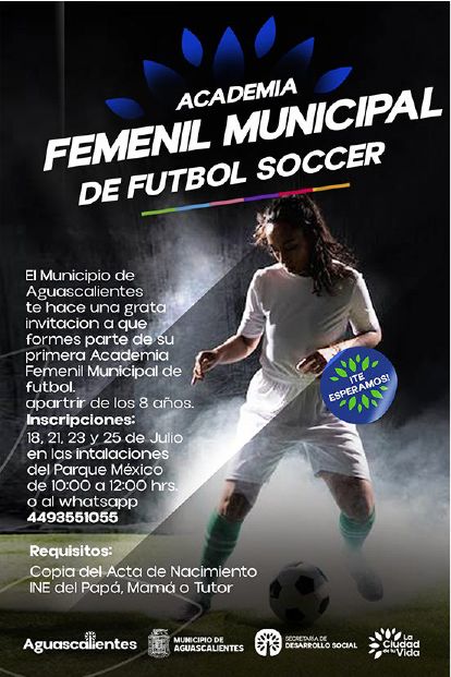 La Secretaría de Desarrollo Social a través de la Dirección de Activación Física, Recreación y Deportes, invita a mujeres y niñas apasionadas del futbol soccer a formar parte de la primera Academia Femenil Municipal de Futbol Soccer, la cual es una opción para desarrollar habilidades deportivas en un entorno seguro y divertido.,