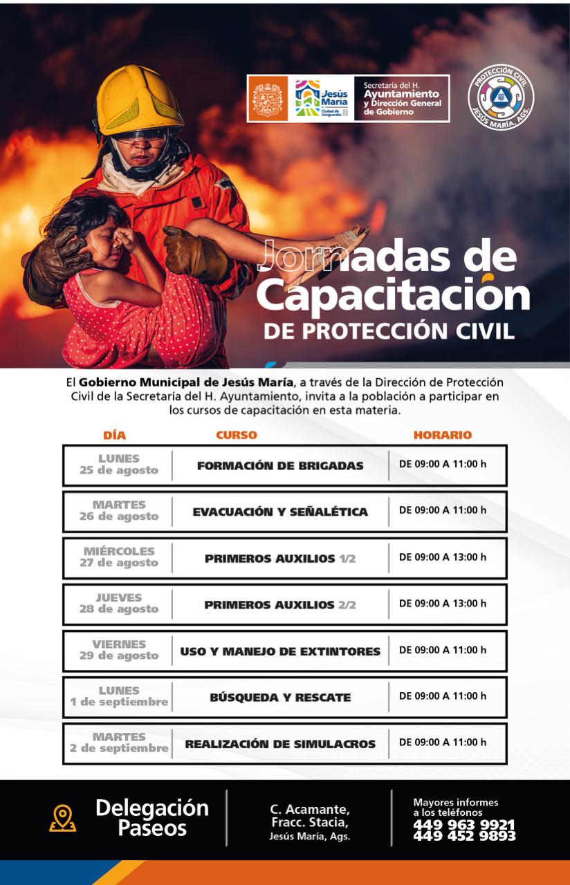 El Gobierno Municipal de Jesús María, a través de la Dirección de Protección Civil, invita a los vecinos de la Delegación Paseos a participar en las Jornadas de Capacitación en Protección Civil, que se llevarán a cabo del 25 de agosto al 2 de septiembre.