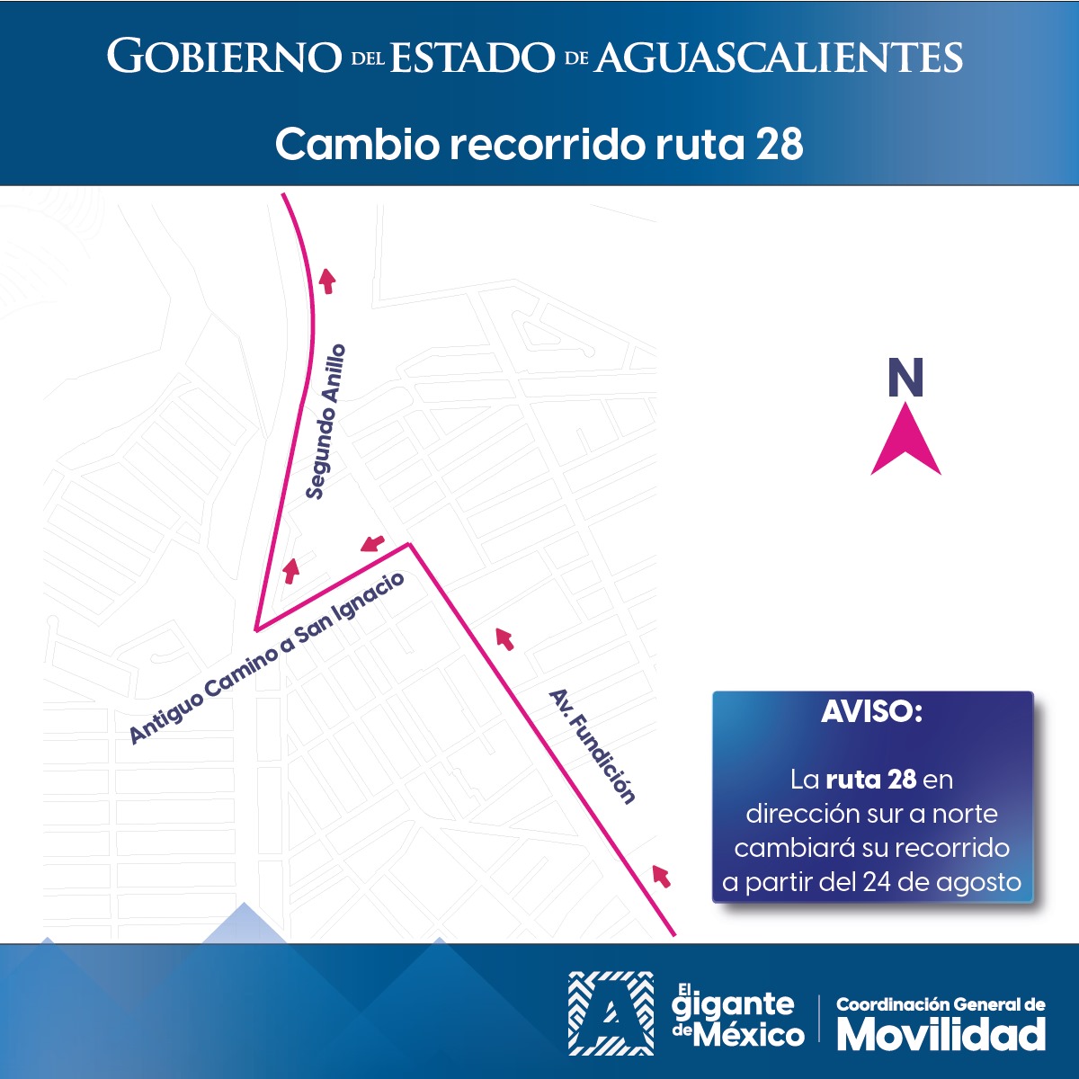 La Coordinación General de Movilidad informa que, a partir del domingo 24 de agosto, la ruta 28 del transporte público cambiará su recorrido en dirección de sur a norte.