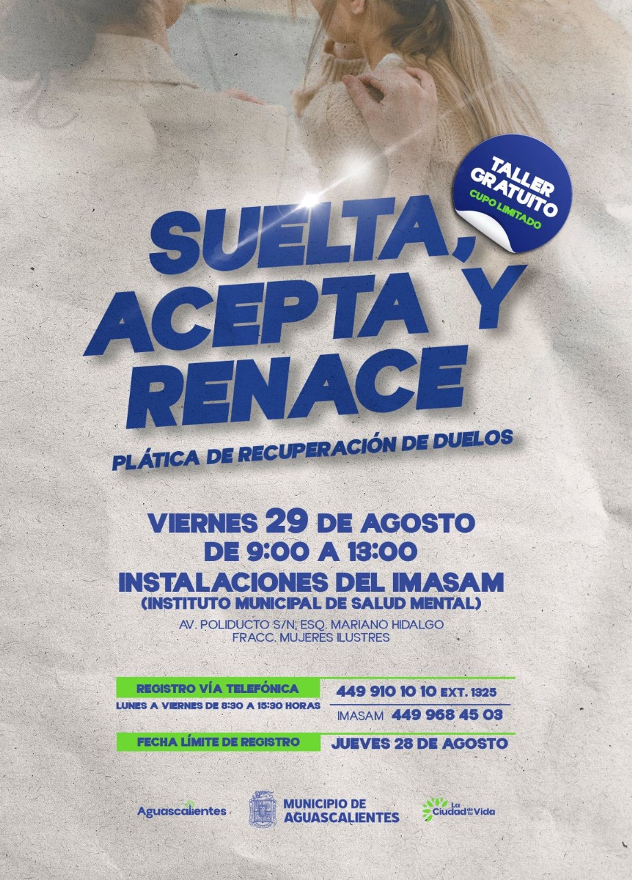El taller es gratuito y tiene cupo limitado, y las personas que deseen asistir deberán registrarse vía telefónica al número 449 910 10 10 extensión 1325 o al Imasam 449 968 45 03, de lunes a viernes de 8:30 a 15:30 horas. La fecha límite de registro es el jueves 28 de agosto.