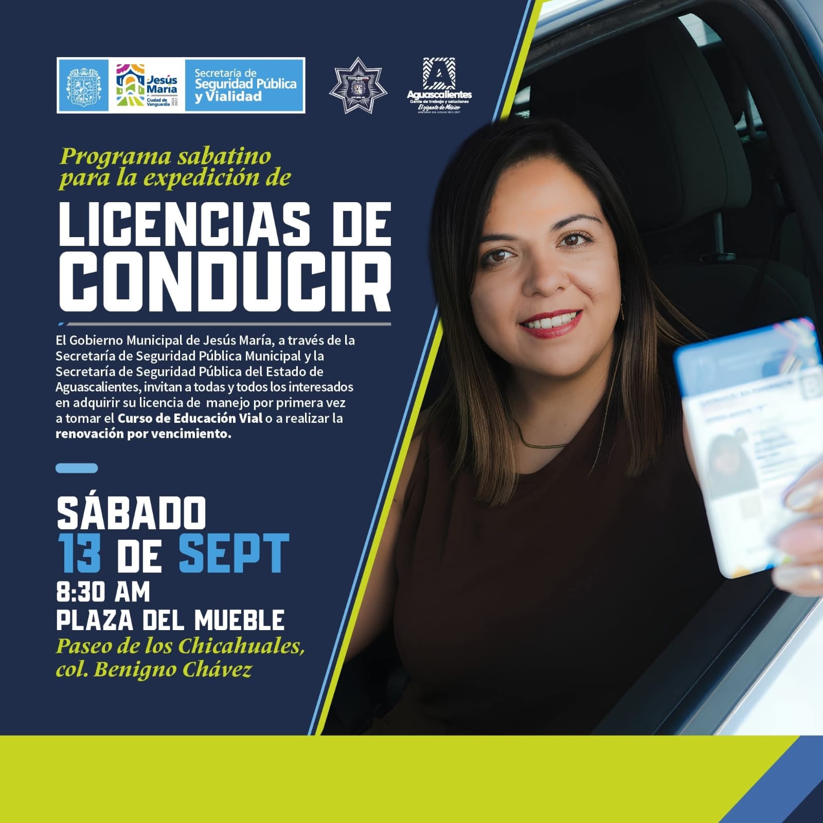 El Gobierno Municipal de Jesús María, en coordinación con la Secretaría de Seguridad Pública y Vialidad Municipal y la Secretaría de Seguridad Pública del Estado, llevará a cabo la Jornada Sabatina para el trámite de licencias de conducir el próximo sábado 13 de septiembre a partir de las 8:30 horas en la Plaza del Mueble, ubicada en Paseo de los Chicahuales, colonia Benigno Chávez.