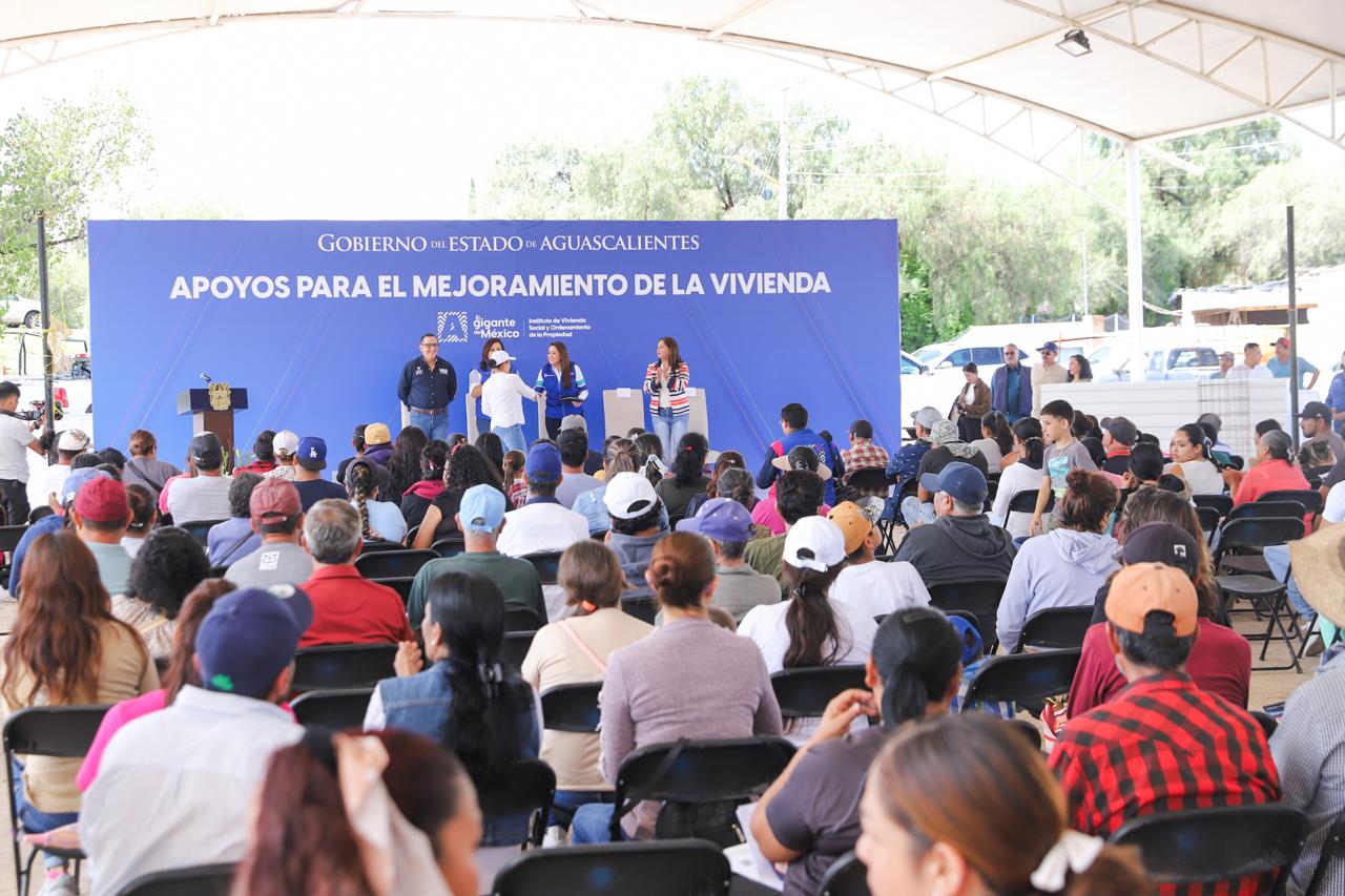La gobernadora de Aguascalientes, Tere Jiménez, entregó material para la construcción de techos, pisos firmes, cuartos adicionales y baños a familias de la comunidad Jesús Terán, en el municipio de El Llano, con el objetivo de que cuenten con un hogar digno y una mejor calidad de vida.