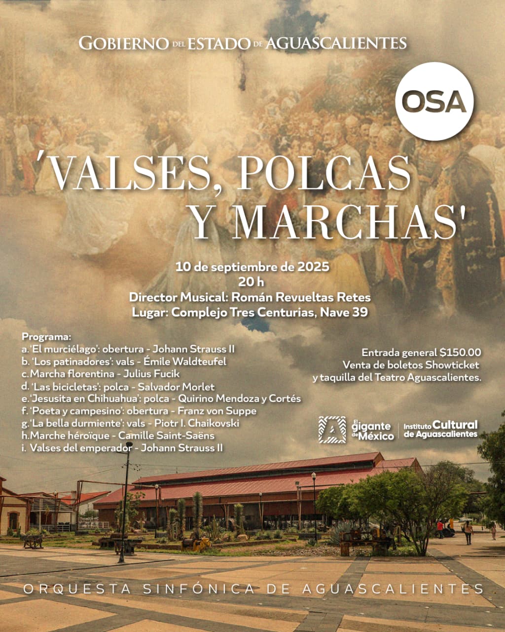 El programa incluye ‘El murciélago’, obertura, Johann Strauss II; ‘Los patinadores’, vals, Émile Waldteufel; Marcha florentina, Julius Fucik; ‘Las bicicletas’, polca, Salvador Morlet; ‘Jesusita en Chihuahua’, polca, Quirino Mendoza y Cortés; ‘Poeta y campesino’, obertura, Franz von Suppe; ‘La bella durmiente’, vals, Piotr I. Chaikovski; Marche héroïque, Camille Saint-Saëns, y ‘Valses del emperador’, Johann Strauss II.
