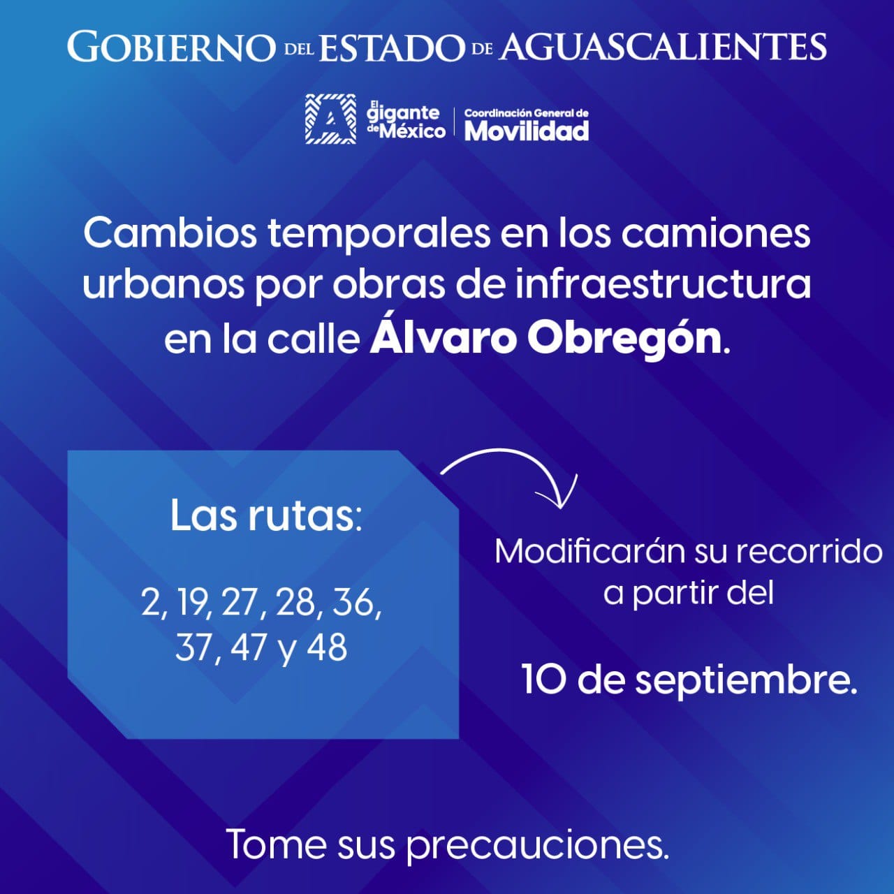 A partir de este miércoles algunas rutas del transporte público sufrirán modificaciones temporales por el cierre parcial al tránsito vehicular en la calle Álvaro Obregón; las rutas de camiones urbanos que circularán por vialidades alternas son: 2, 19, 27, 28, 36, 37, 47 y 48.