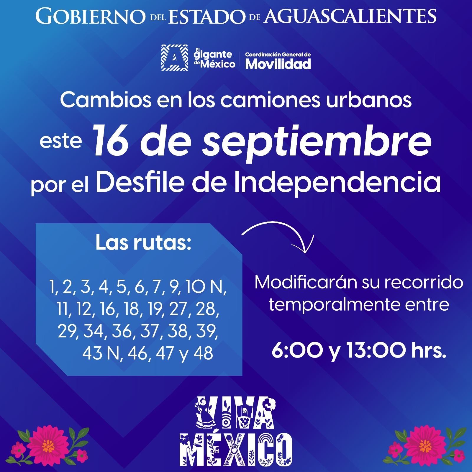 La mañana de este martes 16 de septiembre las rutas 1, 2, 3, 4, 5, 6, 7, 9, 10 N, 11, 12, 16, 18, 19, 27, 28, 29, 34, 36, 37, 38, 39, 43 N, 46, 47 y 48 tendrán modificaciones en su recorrido entre las 6:00 y 13:00 horas, por el Desfile Cívico Militar de la Independencia de México.