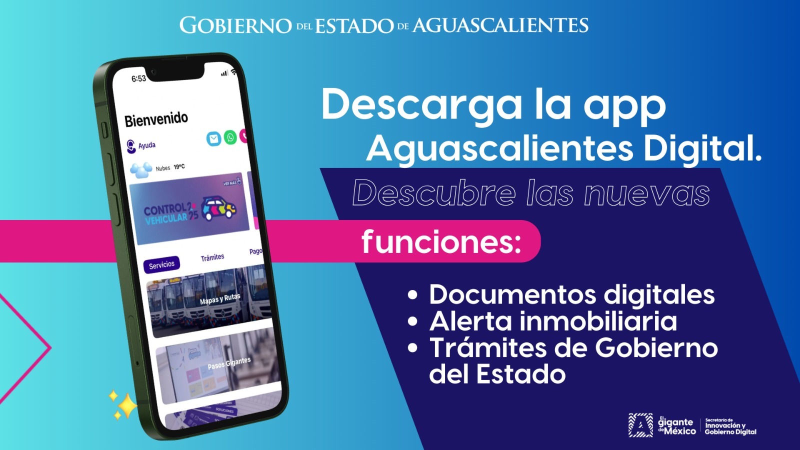 ¿Sabías que con la aplicación Aguascalientes Digital puedes ponerte al día en tus trámites, consultar próximos eventos, dar seguimiento a gestiones de bienes inmuebles, acceder a la plataforma Pasos Gigantes y muchos servicios más? Hoy, más de 170 mil personas ya la utilizan.