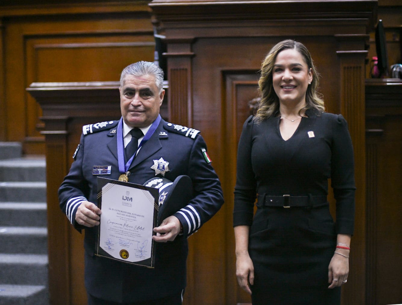 A nombre de la Policía Estatal, el secretario de Seguridad Pública del Estado, Antonio Martínez Romo, recibió la presea de manos de la diputada local Arlette Muñoz Cervantes.