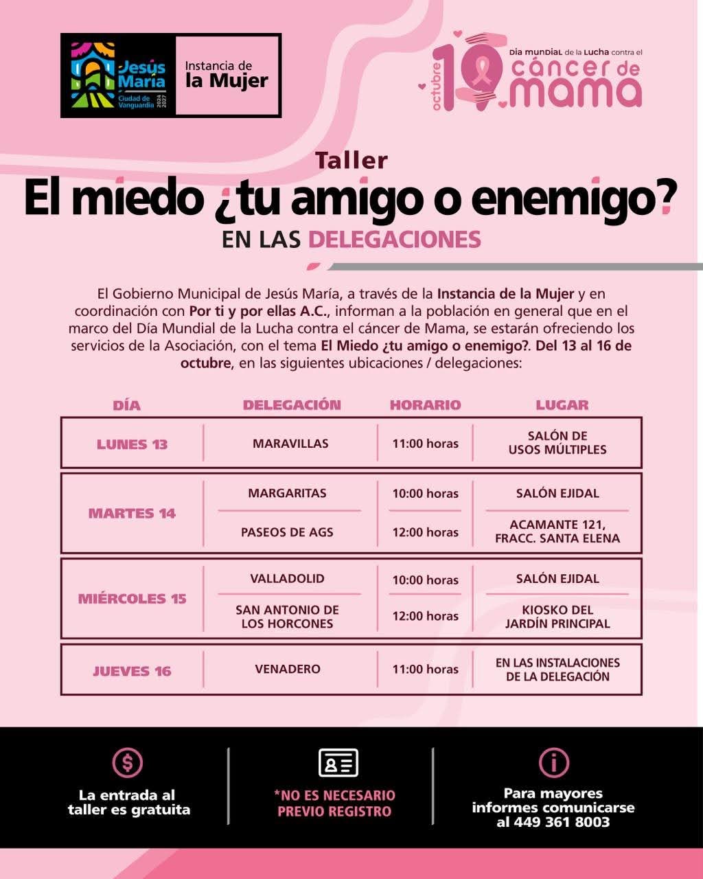 El 13 de octubre el taller se impartirá en la Delegación Maravillas; el día 14 de octubre en las Delegaciones de Margaritas y Paseos de Aguascalientes; el 15 de octubre en Valladolid y San Antonio de los Horcones y el 16 en Venadero.