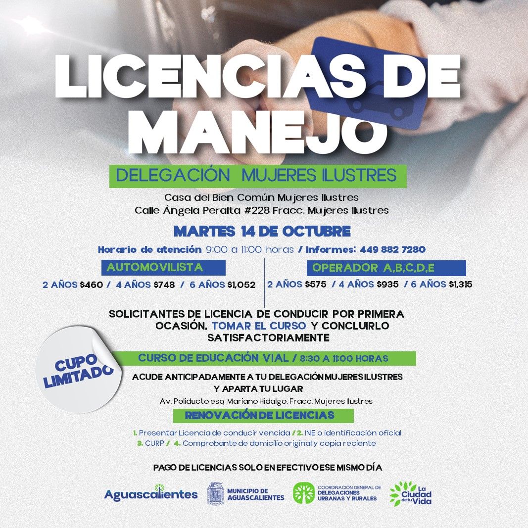 El Municipio de Aguascalientes dio a conocer que el programa de renovación de licencias de manejó brindará el servicio en la Casa del Bien Común del fraccionamiento Mujeres Ilustres el próximo martes 14 de octubre, de las 9:00 a las 11:00 horas.