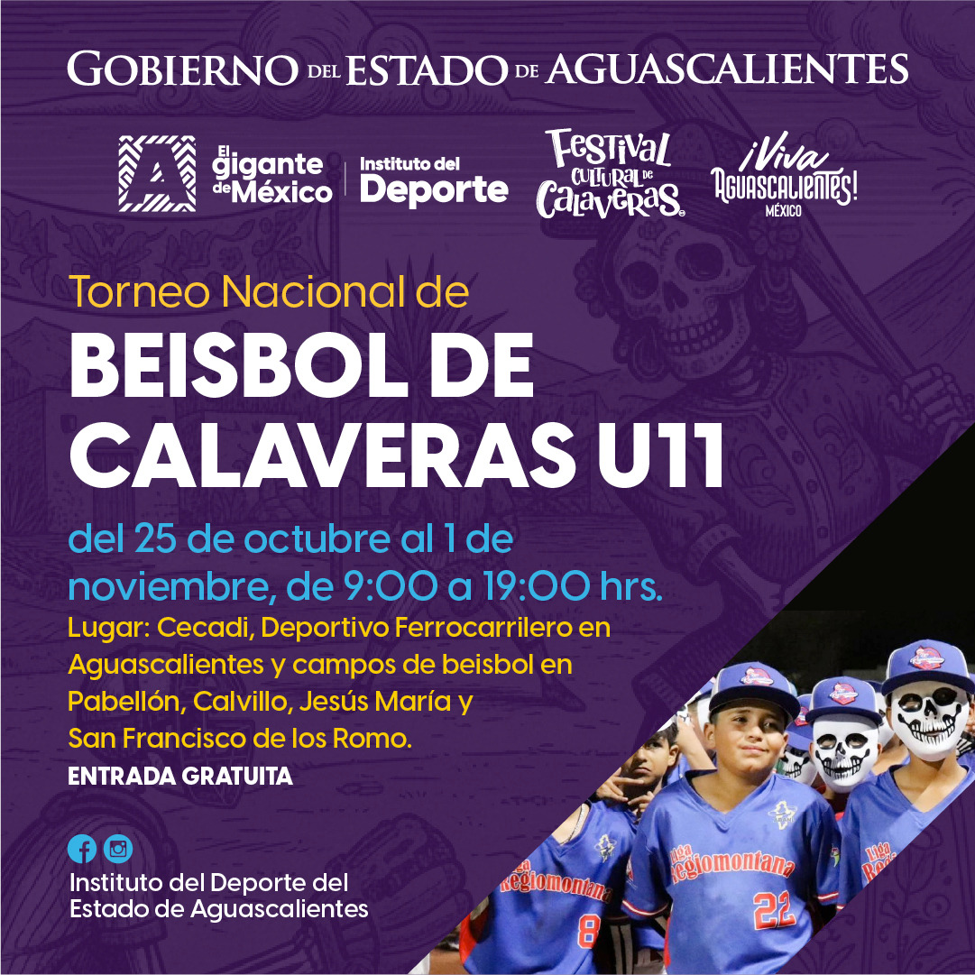 Del 25 de octubre al 1 de noviembre, se realizará el Torneo Nacional de Beisbol de Calaveras U11, en los campos del Deportivo Cecadi (Centro de Capacitación Deportiva Infantil) y en el Deportivo Ferrocarrilero, así como en los municipios de Pabellón de Arteaga, Calvillo, Jesús María y San Francisco de los Romo, también con entrada libre.