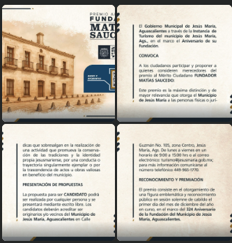 El Gobierno Municipal de Jesús María, a través de la Instancia de Turismo, convoca a la ciudadanía a participar en el Premio al Mérito “Fundador Matías Saucedo”, reconocimiento que distingue a las personas o instituciones que, con su trabajo, compromiso y trayectoria, han contribuido al desarrollo y fortalecimiento de la identidad jesusmariense.