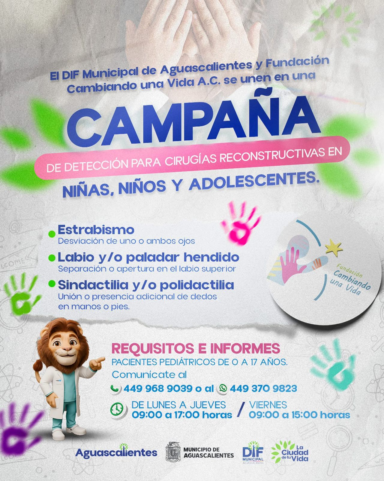 El DIF Municipal de Aguascalientes, en colaboración con la Fundación Cambiando una Vida A.C., pone en marcha la Campaña de Detección para Cirugías Reconstructivas, que se llevará a cabo del 7 de noviembre al 5 de diciembre, dirigida a niñas, niños y adolescentes de 0 a 17 años del municipio capital.