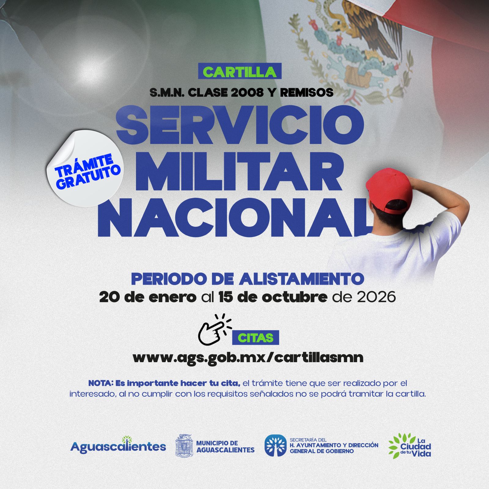 El Municipio de Aguascalientes informa a la población que el periodo de alistamiento para la Cartilla del Servicio Militar Nacional estará abierto del 20 de enero al 15 de octubre de 2026.