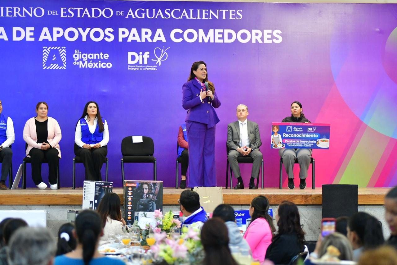 La gobernadora de Aguascalientes, Tere Jiménez, entregó mobiliario y equipo para fortalecer 263 comedores, entre Escolares, Comunitarios y de las Casas del Bien Común, que participan en el programa de Desayunos Calientes del DIF Estatal y que en conjunto benefician a más de 15 mil 900 personas diariamente.