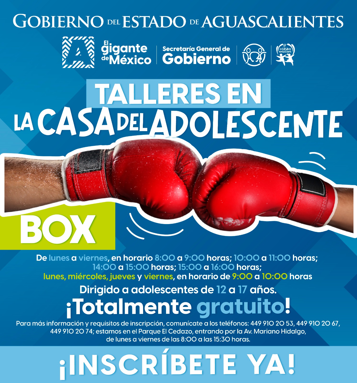 Para más información y requisitos de inscripción, comunícate a los teléfonos: 449 9102053, 449 9102067, 449 9102074. Estamos en el Parque El Cedazo, entrando por av. Mariano Hidalgo, de lunes a viernes, de las 8:00 a las 15:30 horas.