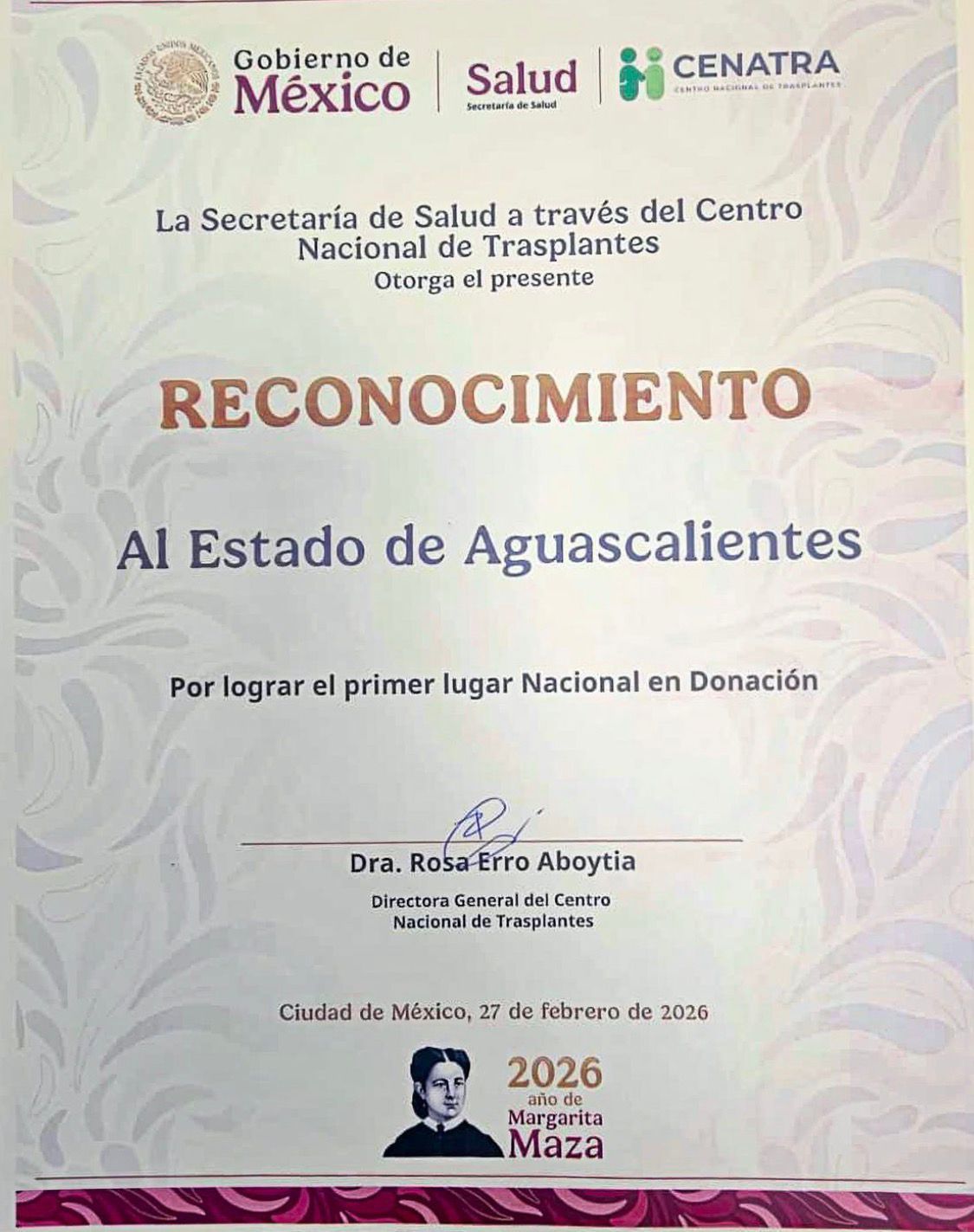 Este logro, otorgado por la Secretaría de Salud federal y el Centro Nacional de Trasplantes (CENATRA), refleja el compromiso institucional, la solidaridad de la ciudadanía y el trabajo coordinado del personal de salud en Aguascalientes.