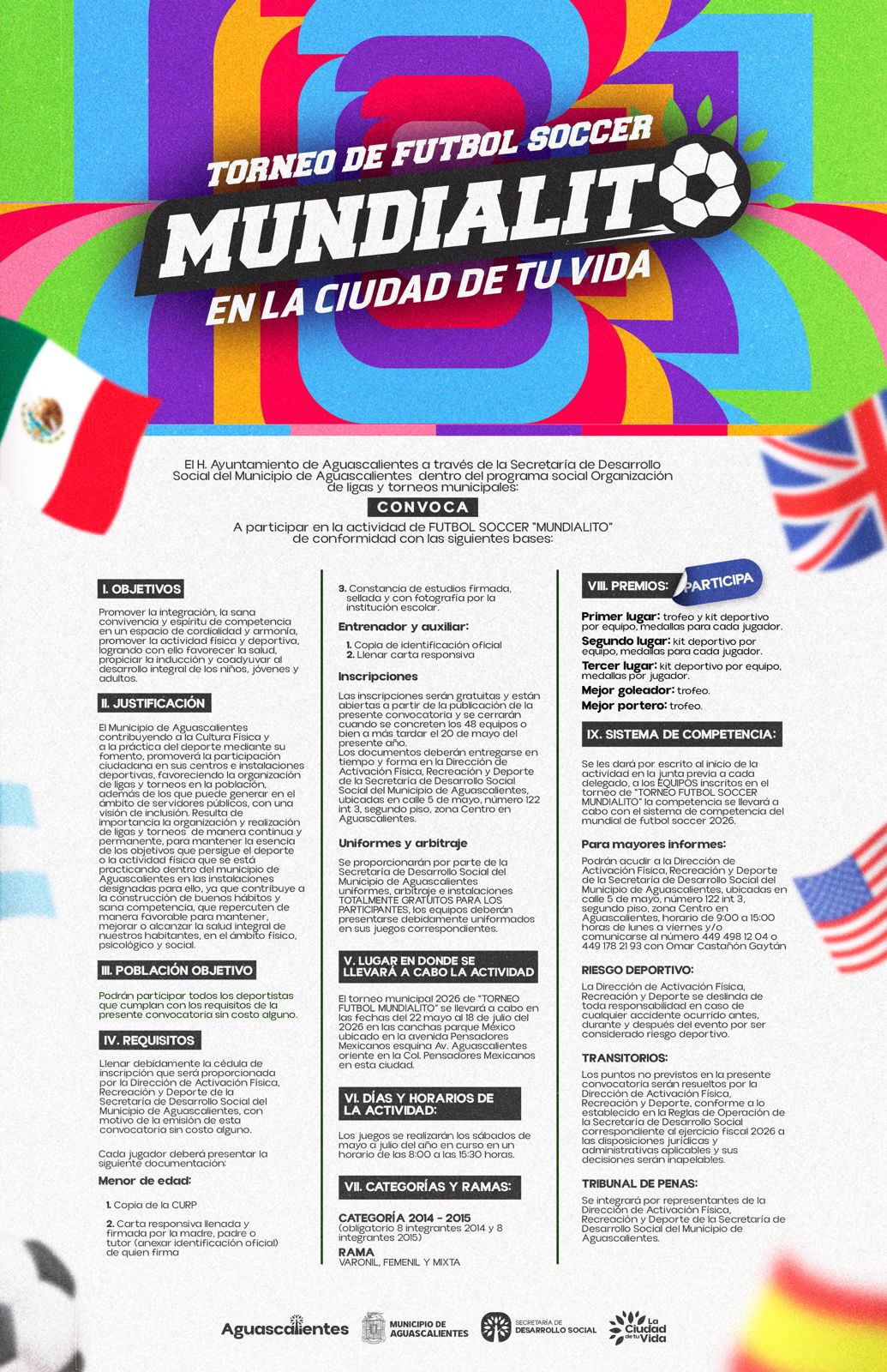 Con el objetivo de promover la práctica del deporte y una vida saludable, el Municipio de Aguascalientes presentó la convocatoria del torneo de fútbol “Mundialito en la Ciudad de tu Vida”, dirigida a niñas y niños de entre 10 y 12 años.