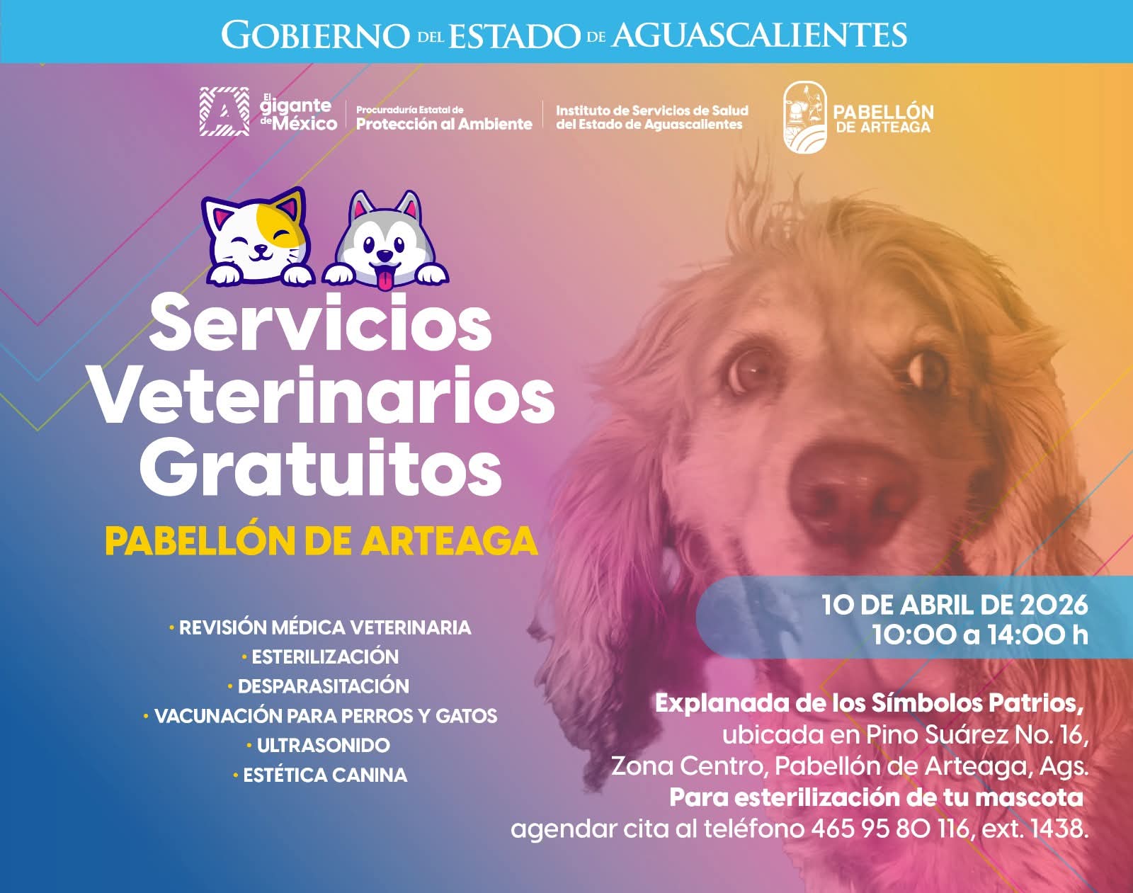 Este viernes, se llevará a cabo una jornada de servicios veterinarios gratuitos en el municipio de Pabellón de Arteaga, en la Explanada de los Símbolos Patrios, ubicada en Pino Suárez No. 16, Zona Centro, en un horario de 10:00 a 14:00 horas.